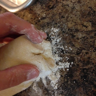 Now you’re ready to ROLL! haha. Gently deflate that puffed up adolescent (is there any other kind? haha). Dump it out onto a (clean!) and floured surface. It helps to kind of form it into a rectangle shaped lump before you begin to roll. Use a little flour to keep things from sticking, but don’t overdo it. Roll your rectangle to roughly 1 foot by 1.5 feet.