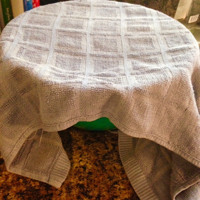 When your dough is no longer super sticky, scrape it off of the dough hook (it shouldn’t stick to your fingers– if it does, shift the dough around and add a bit more flour) and place it into a greased (I just use cooking spray) plastic bowl. Mist the top with cooking spray and cover with a towel.