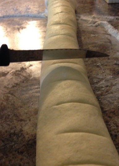 When I first started making cinnamon rolls, I just kind of hacked away at my finished log, and I got all different sizes and shapes of rolls. Some of them would be cowering, tiny and afraid, in the pan, while other, overachieving taller ones, towered over them. It wasn’t pretty. It tasted good, but looked horrible. This is an easy way to avoid cinnamon roll envy. Each log makes a nice 16 pieces. Using the dull end of a knife (you don’t want to cut yet– just mark), divide the dough in half. This makes 2 halves. Then mark half of each of those halves. Now you have 4 equal pieces. Divide in halves again and again until you have 16 equal pieces. All you have to do is divide in half and do it again and again– so you don’t have to try to eyeball 16 equal portions. Hope that makes sense.