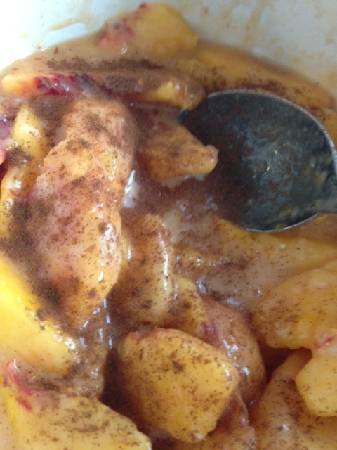 Mix up your sugars and peaches and allow the mixture to sit for a few minutes, while the fruit absorbs the flavor. This is a good time to taste test. Get a clean spoon each time, but taste away! 🙂