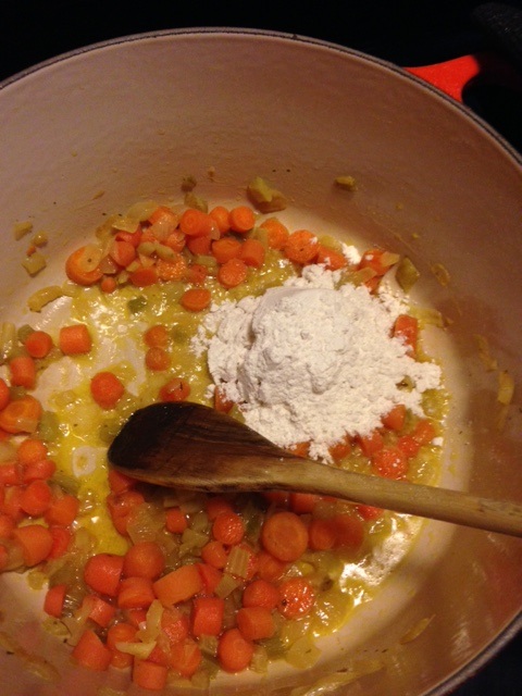 Cook these vegetables for about 5-10 minutes, until they soften. You don’t want them mushy– just soft enough that you can poke a knife through them easily. Turn your heat down a bit and add the flour. If you have a Gluten sensitivity, cornstarch can easily be substituted at the end (not at this point), dissolved in a few tsp. of water. Ask me if you need clarification on this.