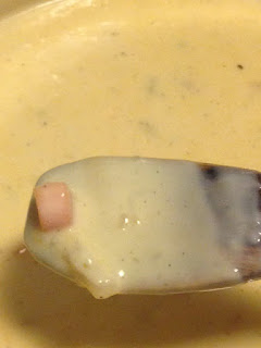 This is the soup after the milk and cheese have been added. See how the soup coats the spoon, but isn’t terribly thick or thin? That’s what it should look like.