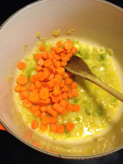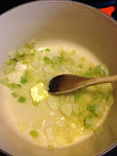 Add in your onions and celery. You can feel free to add more than I have indicated, if you want. Adding extra veggies to a soup is a great way to add heartiness without adding a lot of calories.