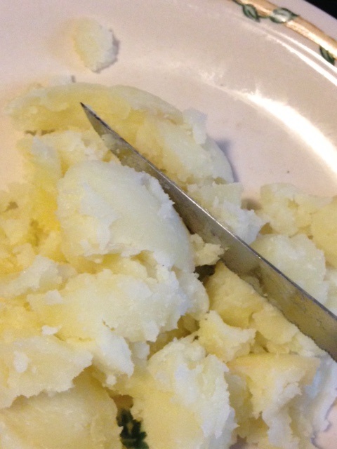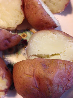 At this point, your potatoes should be done. If they are nice and soft, go ahead and split them open and scoop out the fillings with a spoon. We don’t want the skins– just the soft, puffy insides.