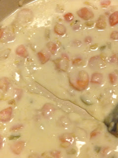 Here is the soup with all the milk added. Think cream soup. Don’t worry if it isn’t as thick as you want– it will thicken even more as it heats, and the addition of cheese and baked potato filling will make it even thicker.
