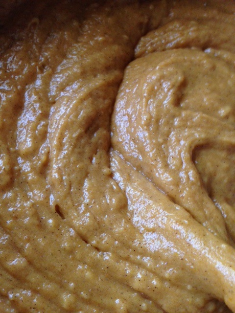 First, whisk together your pumpkin puree, applesauce, oil, sugar, eggs, and spices. Think deep thoughts.