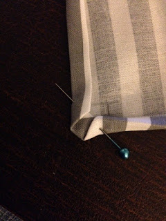 This is an example of another corner that I chose to do in a point, rather than as a squared edge, like I did with the striped napkin. You can do your corners either way– or use a variety. Whatever floats your boat. If you want the corners more pointy, just pull the pieces together so that they touch. If you want squared edges, don’t allow the sides to touch. Just keep messing with it until it looks the way you want it to be. Then pin in place.
