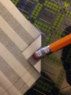 Get out a ruler and measure yourself a square 18″ by 18″. The fat quarter should be 18″, already, on the short side, but check it, just to make sure. If your quarter is exactly 18″, then you can fold the material, triangle, across itself, and just draw yourself a nice square and check that. Easy peasy.